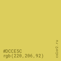 Цвет #DCCE5C в цветовой модели RGB обозначается тремя октетами (220, 206, 92) в десятичном формате и #DCCE5C в шестнадцатиричном (hex) формате, которые являются интенсивностью красного 220 (hex DC), интенсивность зелёного 206 (hex CE) и интенсивность синего 92 (hex 5C).