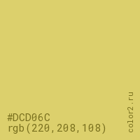 Цвет #DCD06C в цветовой модели RGB обозначается тремя октетами (220, 208, 108) в десятичном формате и #DCD06C в шестнадцатиричном (hex) формате, которые являются интенсивностью красного 220 (hex DC), интенсивность зелёного 208 (hex D0) и интенсивность синего 108 (hex 6C).