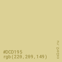 Цвет #DCD195 в цветовой модели RGB обозначается тремя октетами (220, 209, 149) в десятичном формате и #DCD195 в шестнадцатиричном (hex) формате, которые являются интенсивностью красного 220 (hex DC), интенсивность зелёного 209 (hex D1) и интенсивность синего 149 (hex 95).