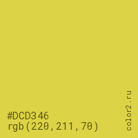 Цвет #DCD346 в цветовой модели RGB обозначается тремя октетами (220, 211, 70) в десятичном формате и #DCD346 в шестнадцатиричном (hex) формате, которые являются интенсивностью красного 220 (hex DC), интенсивность зелёного 211 (hex D3) и интенсивность синего 70 (hex 46).