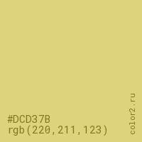 Цвет #DCD37B в цветовой модели RGB обозначается тремя октетами (220, 211, 123) в десятичном формате и #DCD37B в шестнадцатиричном (hex) формате, которые являются интенсивностью красного 220 (hex DC), интенсивность зелёного 211 (hex D3) и интенсивность синего 123 (hex 7B).