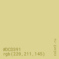 Цвет #DCD391 в цветовой модели RGB обозначается тремя октетами (220, 211, 145) в десятичном формате и #DCD391 в шестнадцатиричном (hex) формате, которые являются интенсивностью красного 220 (hex DC), интенсивность зелёного 211 (hex D3) и интенсивность синего 145 (hex 91).