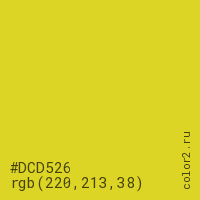 Цвет #DCD526 в цветовой модели RGB обозначается тремя октетами (220, 213, 38) в десятичном формате и #DCD526 в шестнадцатиричном (hex) формате, которые являются интенсивностью красного 220 (hex DC), интенсивность зелёного 213 (hex D5) и интенсивность синего 38 (hex 26).