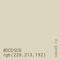 Цвет #DCD5C0 в цветовой модели RGB обозначается тремя октетами (220, 213, 192) в десятичном формате и #DCD5C0 в шестнадцатиричном (hex) формате, которые являются интенсивностью красного 220 (hex DC), интенсивность зелёного 213 (hex D5) и интенсивность синего 192 (hex C0).