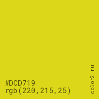 Цвет #DCD719 в цветовой модели RGB обозначается тремя октетами (220, 215, 25) в десятичном формате и #DCD719 в шестнадцатиричном (hex) формате, которые являются интенсивностью красного 220 (hex DC), интенсивность зелёного 215 (hex D7) и интенсивность синего 25 (hex 19).