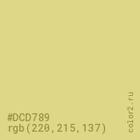 Цвет #DCD789 в цветовой модели RGB обозначается тремя октетами (220, 215, 137) в десятичном формате и #DCD789 в шестнадцатиричном (hex) формате, которые являются интенсивностью красного 220 (hex DC), интенсивность зелёного 215 (hex D7) и интенсивность синего 137 (hex 89).