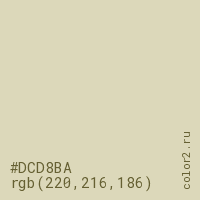 Цвет #DCD8BA в цветовой модели RGB обозначается тремя октетами (220, 216, 186) в десятичном формате и #DCD8BA в шестнадцатиричном (hex) формате, которые являются интенсивностью красного 220 (hex DC), интенсивность зелёного 216 (hex D8) и интенсивность синего 186 (hex BA).