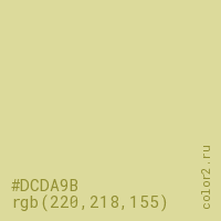 Цвет #DCDA9B в цветовой модели RGB обозначается тремя октетами (220, 218, 155) в десятичном формате и #DCDA9B в шестнадцатиричном (hex) формате, которые являются интенсивностью красного 220 (hex DC), интенсивность зелёного 218 (hex DA) и интенсивность синего 155 (hex 9B).