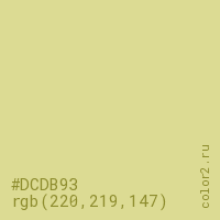 Цвет #DCDB93 в цветовой модели RGB обозначается тремя октетами (220, 219, 147) в десятичном формате и #DCDB93 в шестнадцатиричном (hex) формате, которые являются интенсивностью красного 220 (hex DC), интенсивность зелёного 219 (hex DB) и интенсивность синего 147 (hex 93).