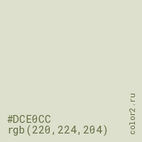 Цвет #DCE0CC в цветовой модели RGB обозначается тремя октетами (220, 224, 204) в десятичном формате и #DCE0CC в шестнадцатиричном (hex) формате, которые являются интенсивностью красного 220 (hex DC), интенсивность зелёного 224 (hex E0) и интенсивность синего 204 (hex CC).