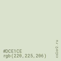 Цвет #DCE1CE в цветовой модели RGB обозначается тремя октетами (220, 225, 206) в десятичном формате и #DCE1CE в шестнадцатиричном (hex) формате, которые являются интенсивностью красного 220 (hex DC), интенсивность зелёного 225 (hex E1) и интенсивность синего 206 (hex CE).