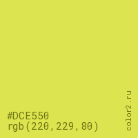 Цвет #DCE550 в цветовой модели RGB обозначается тремя октетами (220, 229, 80) в десятичном формате и #DCE550 в шестнадцатиричном (hex) формате, которые являются интенсивностью красного 220 (hex DC), интенсивность зелёного 229 (hex E5) и интенсивность синего 80 (hex 50).