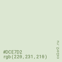 Цвет #DCE7D2 в цветовой модели RGB обозначается тремя октетами (220, 231, 210) в десятичном формате и #DCE7D2 в шестнадцатиричном (hex) формате, которые являются интенсивностью красного 220 (hex DC), интенсивность зелёного 231 (hex E7) и интенсивность синего 210 (hex D2).
