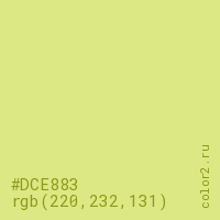 Цвет #DCE883 в цветовой модели RGB обозначается тремя октетами (220, 232, 131) в десятичном формате и #DCE883 в шестнадцатиричном (hex) формате, которые являются интенсивностью красного 220 (hex DC), интенсивность зелёного 232 (hex E8) и интенсивность синего 131 (hex 83).