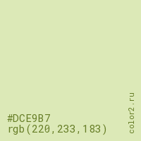 Цвет #DCE9B7 в цветовой модели RGB обозначается тремя октетами (220, 233, 183) в десятичном формате и #DCE9B7 в шестнадцатиричном (hex) формате, которые являются интенсивностью красного 220 (hex DC), интенсивность зелёного 233 (hex E9) и интенсивность синего 183 (hex B7).