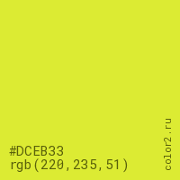 Цвет #DCEB33 в цветовой модели RGB обозначается тремя октетами (220, 235, 51) в десятичном формате и #DCEB33 в шестнадцатиричном (hex) формате, которые являются интенсивностью красного 220 (hex DC), интенсивность зелёного 235 (hex EB) и интенсивность синего 51 (hex 33).