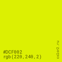 Цвет #DCF002 в цветовой модели RGB обозначается тремя октетами (220, 240, 2) в десятичном формате и #DCF002 в шестнадцатиричном (hex) формате, которые являются интенсивностью красного 220 (hex DC), интенсивность зелёного 240 (hex F0) и интенсивность синего 2 (hex 02).