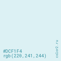 Цвет #DCF1F4 в цветовой модели RGB обозначается тремя октетами (220, 241, 244) в десятичном формате и #DCF1F4 в шестнадцатиричном (hex) формате, которые являются интенсивностью красного 220 (hex DC), интенсивность зелёного 241 (hex F1) и интенсивность синего 244 (hex F4).