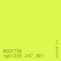 Цвет #DCF750 в цветовой модели RGB обозначается тремя октетами (220, 247, 80) в десятичном формате и #DCF750 в шестнадцатиричном (hex) формате, которые являются интенсивностью красного 220 (hex DC), интенсивность зелёного 247 (hex F7) и интенсивность синего 80 (hex 50).