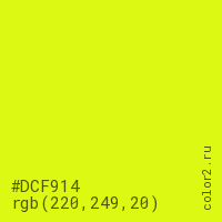 Цвет #DCF914 в цветовой модели RGB обозначается тремя октетами (220, 249, 20) в десятичном формате и #DCF914 в шестнадцатиричном (hex) формате, которые являются интенсивностью красного 220 (hex DC), интенсивность зелёного 249 (hex F9) и интенсивность синего 20 (hex 14).