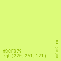 Цвет #DCFB79 в цветовой модели RGB обозначается тремя октетами (220, 251, 121) в десятичном формате и #DCFB79 в шестнадцатиричном (hex) формате, которые являются интенсивностью красного 220 (hex DC), интенсивность зелёного 251 (hex FB) и интенсивность синего 121 (hex 79).