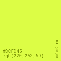 Цвет #DCFD45 в цветовой модели RGB обозначается тремя октетами (220, 253, 69) в десятичном формате и #DCFD45 в шестнадцатиричном (hex) формате, которые являются интенсивностью красного 220 (hex DC), интенсивность зелёного 253 (hex FD) и интенсивность синего 69 (hex 45).
