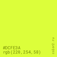 Цвет #DCFE3A в цветовой модели RGB обозначается тремя октетами (220, 254, 58) в десятичном формате и #DCFE3A в шестнадцатиричном (hex) формате, которые являются интенсивностью красного 220 (hex DC), интенсивность зелёного 254 (hex FE) и интенсивность синего 58 (hex 3A).