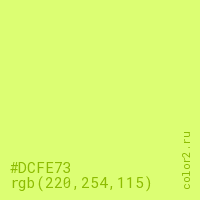 Цвет #DCFE73 в цветовой модели RGB обозначается тремя октетами (220, 254, 115) в десятичном формате и #DCFE73 в шестнадцатиричном (hex) формате, которые являются интенсивностью красного 220 (hex DC), интенсивность зелёного 254 (hex FE) и интенсивность синего 115 (hex 73).