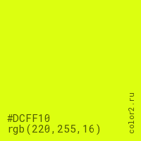 Цвет #DCFF10 в цветовой модели RGB обозначается тремя октетами (220, 255, 16) в десятичном формате и #DCFF10 в шестнадцатиричном (hex) формате, которые являются интенсивностью красного 220 (hex DC), интенсивность зелёного 255 (hex FF) и интенсивность синего 16 (hex 10).