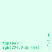 Цвет #DCFFEE в цветовой модели RGB обозначается тремя октетами (220, 255, 238) в десятичном формате и #DCFFEE в шестнадцатиричном (hex) формате, которые являются интенсивностью красного 220 (hex DC), интенсивность зелёного 255 (hex FF) и интенсивность синего 238 (hex EE).