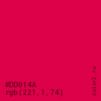 Цвет #DD014A в цветовой модели RGB обозначается тремя октетами (221, 1, 74) в десятичном формате и #DD014A в шестнадцатиричном (hex) формате, которые являются интенсивностью красного 221 (hex DD), интенсивность зелёного 1 (hex 01) и интенсивность синего 74 (hex 4A).