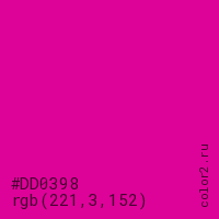 Цвет #DD0398 в цветовой модели RGB обозначается тремя октетами (221, 3, 152) в десятичном формате и #DD0398 в шестнадцатиричном (hex) формате, которые являются интенсивностью красного 221 (hex DD), интенсивность зелёного 3 (hex 03) и интенсивность синего 152 (hex 98).