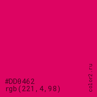 Цвет #DD0462 в цветовой модели RGB обозначается тремя октетами (221, 4, 98) в десятичном формате и #DD0462 в шестнадцатиричном (hex) формате, которые являются интенсивностью красного 221 (hex DD), интенсивность зелёного 4 (hex 04) и интенсивность синего 98 (hex 62).