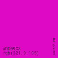 Цвет #DD09C3 в цветовой модели RGB обозначается тремя октетами (221, 9, 195) в десятичном формате и #DD09C3 в шестнадцатиричном (hex) формате, которые являются интенсивностью красного 221 (hex DD), интенсивность зелёного 9 (hex 09) и интенсивность синего 195 (hex C3).