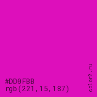Цвет #DD0FBB в цветовой модели RGB обозначается тремя октетами (221, 15, 187) в десятичном формате и #DD0FBB в шестнадцатиричном (hex) формате, которые являются интенсивностью красного 221 (hex DD), интенсивность зелёного 15 (hex 0F) и интенсивность синего 187 (hex BB).