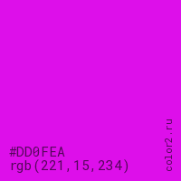 Цвет #DD0FEA в цветовой модели RGB обозначается тремя октетами (221, 15, 234) в десятичном формате и #DD0FEA в шестнадцатиричном (hex) формате, которые являются интенсивностью красного 221 (hex DD), интенсивность зелёного 15 (hex 0F) и интенсивность синего 234 (hex EA).