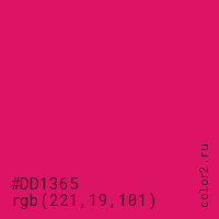 Цвет #DD1365 в цветовой модели RGB обозначается тремя октетами (221, 19, 101) в десятичном формате и #DD1365 в шестнадцатиричном (hex) формате, которые являются интенсивностью красного 221 (hex DD), интенсивность зелёного 19 (hex 13) и интенсивность синего 101 (hex 65).