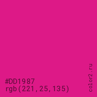 Цвет #DD1987 в цветовой модели RGB обозначается тремя октетами (221, 25, 135) в десятичном формате и #DD1987 в шестнадцатиричном (hex) формате, которые являются интенсивностью красного 221 (hex DD), интенсивность зелёного 25 (hex 19) и интенсивность синего 135 (hex 87).