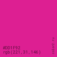 Цвет #DD1F92 в цветовой модели RGB обозначается тремя октетами (221, 31, 146) в десятичном формате и #DD1F92 в шестнадцатиричном (hex) формате, которые являются интенсивностью красного 221 (hex DD), интенсивность зелёного 31 (hex 1F) и интенсивность синего 146 (hex 92).