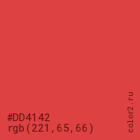 Цвет #DD4142 в цветовой модели RGB обозначается тремя октетами (221, 65, 66) в десятичном формате и #DD4142 в шестнадцатиричном (hex) формате, которые являются интенсивностью красного 221 (hex DD), интенсивность зелёного 65 (hex 41) и интенсивность синего 66 (hex 42).