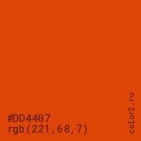 Цвет #DD4407 в цветовой модели RGB обозначается тремя октетами (221, 68, 7) в десятичном формате и #DD4407 в шестнадцатиричном (hex) формате, которые являются интенсивностью красного 221 (hex DD), интенсивность зелёного 68 (hex 44) и интенсивность синего 7 (hex 07).