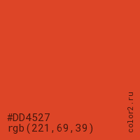 Цвет #DD4527 в цветовой модели RGB обозначается тремя октетами (221, 69, 39) в десятичном формате и #DD4527 в шестнадцатиричном (hex) формате, которые являются интенсивностью красного 221 (hex DD), интенсивность зелёного 69 (hex 45) и интенсивность синего 39 (hex 27).