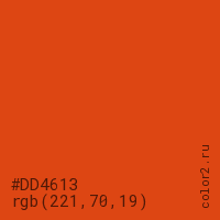 Цвет #DD4613 в цветовой модели RGB обозначается тремя октетами (221, 70, 19) в десятичном формате и #DD4613 в шестнадцатиричном (hex) формате, которые являются интенсивностью красного 221 (hex DD), интенсивность зелёного 70 (hex 46) и интенсивность синего 19 (hex 13).