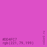 Цвет #DD4FC7 в цветовой модели RGB обозначается тремя октетами (221, 79, 199) в десятичном формате и #DD4FC7 в шестнадцатиричном (hex) формате, которые являются интенсивностью красного 221 (hex DD), интенсивность зелёного 79 (hex 4F) и интенсивность синего 199 (hex C7).