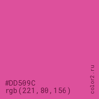 Цвет #DD509C в цветовой модели RGB обозначается тремя октетами (221, 80, 156) в десятичном формате и #DD509C в шестнадцатиричном (hex) формате, которые являются интенсивностью красного 221 (hex DD), интенсивность зелёного 80 (hex 50) и интенсивность синего 156 (hex 9C).