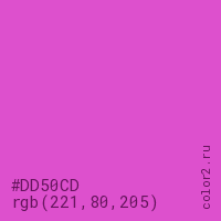 Цвет #DD50CD в цветовой модели RGB обозначается тремя октетами (221, 80, 205) в десятичном формате и #DD50CD в шестнадцатиричном (hex) формате, которые являются интенсивностью красного 221 (hex DD), интенсивность зелёного 80 (hex 50) и интенсивность синего 205 (hex CD).