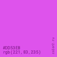 Цвет #DD53EB в цветовой модели RGB обозначается тремя октетами (221, 83, 235) в десятичном формате и #DD53EB в шестнадцатиричном (hex) формате, которые являются интенсивностью красного 221 (hex DD), интенсивность зелёного 83 (hex 53) и интенсивность синего 235 (hex EB).
