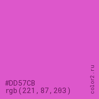 Цвет #DD57CB в цветовой модели RGB обозначается тремя октетами (221, 87, 203) в десятичном формате и #DD57CB в шестнадцатиричном (hex) формате, которые являются интенсивностью красного 221 (hex DD), интенсивность зелёного 87 (hex 57) и интенсивность синего 203 (hex CB).