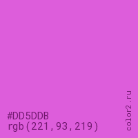 Цвет #DD5DDB в цветовой модели RGB обозначается тремя октетами (221, 93, 219) в десятичном формате и #DD5DDB в шестнадцатиричном (hex) формате, которые являются интенсивностью красного 221 (hex DD), интенсивность зелёного 93 (hex 5D) и интенсивность синего 219 (hex DB).