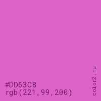 Цвет #DD63C8 в цветовой модели RGB обозначается тремя октетами (221, 99, 200) в десятичном формате и #DD63C8 в шестнадцатиричном (hex) формате, которые являются интенсивностью красного 221 (hex DD), интенсивность зелёного 99 (hex 63) и интенсивность синего 200 (hex C8).